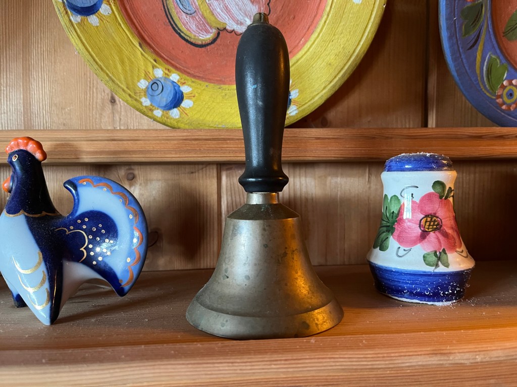 Her på hytta faller vi litt tilbake i stereotype kjønnsroller. Siden jeg ikke er så hendig med verken motorsag eller hammer, blir jeg stående mer på kjøkkenet her enn ellers. Når det er middagstid, kunne jeg ha sendt en SMS for å kalle inn til måltidet, men istedet åpner jeg vinduet og bruker den gamle matklokken. Når den ringer, vet de som hører den at det er mat å få.