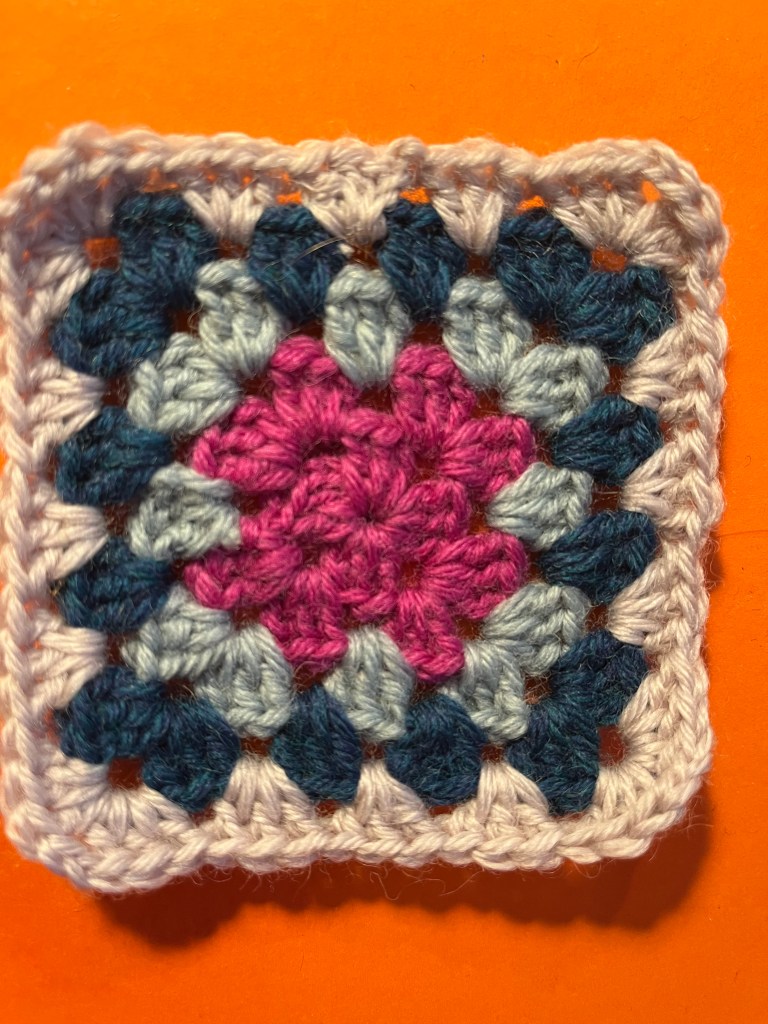 En bestemorsrute ser ut som en slags blomst, med i alt 3 farger og så en bunnfarge som går igjen på alle lappene. Ambisjonen min er at ikke to ruter i teppet skal være like. Det vil si, to lapper kan godt inneholde de samme fargene, men ikke i samme rekkefølge.