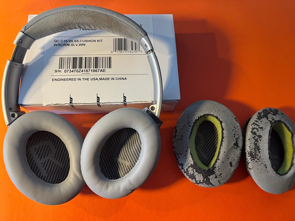Jeg har et Bose lyddempende headset, som ble kjøpt omtrent på den tiden da de akkurat hadde gått over fra headset som du måtte sette batterier i, til oppladbare modeller. Det vil si at det er en god del år siden. Men etterhvert ble øreputene slitt, sprukne og sammensunkne, og det havnet i nederste skrivebordskuff. Det fungerte fortsatt, men så ut som en skraphaug.