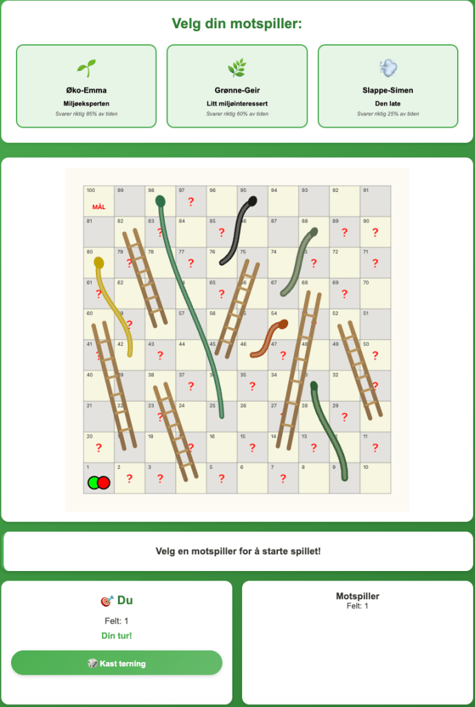Så unna vei, programmerere, her kommer jeg og min nye bestevenn Claude Code og min gamle kompis Chat GPT. Sammen har vi i løpet av en helg laget et digitalt brettspill inspirert av det klassiske «Snakes and ladders» eller «Stigespill», men med innlagte miljøspørsmål, som kan gi ekstra terningkast.