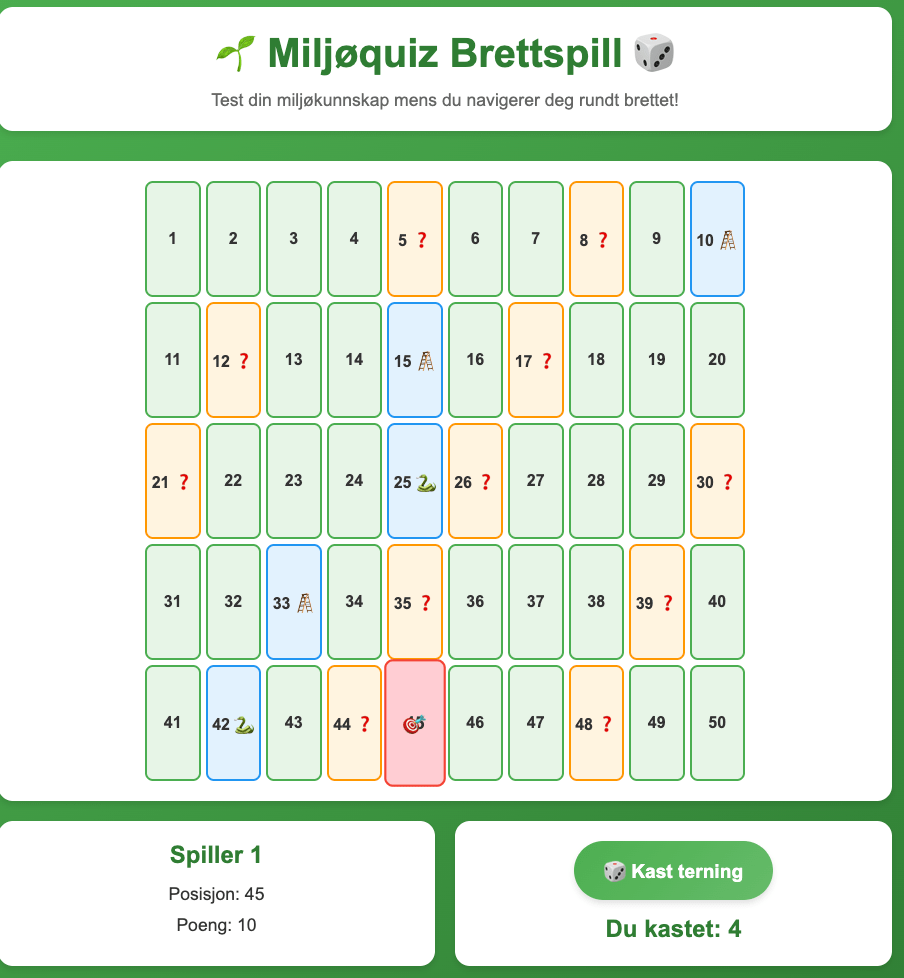 - Spillogikk: Objektsorientert JavaScript med en hovedklasse (MiljoQuizGame) som håndterer spilltilstand, terningkast, spillerbevegelser og AI-logikk.